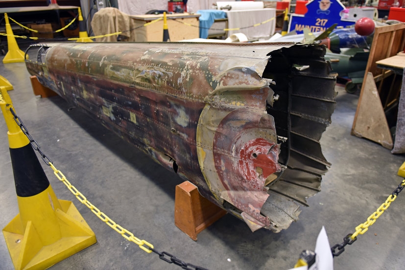 Tail section from the Hampden wreckage, showing the original paintwork and combat damage