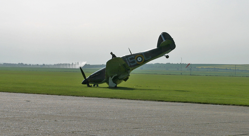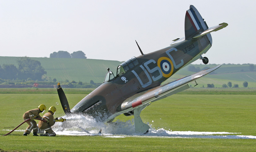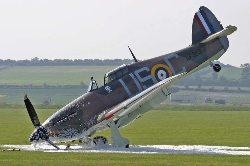 From my recollections of the day and having subsequently seen video footage of the incident, it appears that the pilot of our subject Hurricane LF363 performed a textbook curved approach to the airfield and a gentle three-point landing, but almost as soon as the aircraft was on the ground, the starboard undercarriage leg began to slowly give way. Causing the starboard wing to gracefully dip and eventually scrape along the grass airfield, the drag caused the fighter to slew to the right, heading towards a number of aircraft which were parked in preparation for the days entertainment. As I am not a qualified pilot and can only describe what I saw, it appears that in a display of exceptional airmanship, the pilot, who was fully aware of the situation and determined to avoid the potential of a collision, turned his aircraft inside the arc of the slew, increasing the rate of turn away from other aircraft, but causing the propeller to strike the ground and bringing the aircraft to rest in a rather unflattering tail in the air attitude. The emergency services were quickly on the scene and gave the Hurricane a precautionary spray of fire retardant foam, but things did not get any worse and the pilot walked unscathed from the incident.
