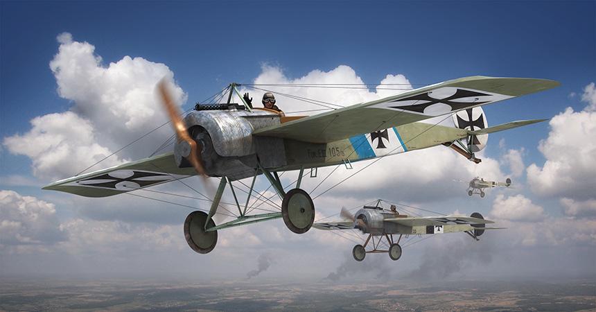 These two classic Great War aircraft which fought this deadly duel for early air supremacy over the battlefields of the Western Front also occupy quite a significant position in the history of our Airfix blog, as they were the first two 1/72nd scale new tooling announcements included in the very first edition of Workbench in July 2015. Incorporating impressive levels of detail into these diminutive, yet famous aeroplanes, the Airfix designers were quick to make their own contribution to four years of Great War centenary commemorations, by presenting modellers with two new aircraft from this period and as both were engaged in savage aerial combat during 1915, it is somehow fitting that both model versions were announced at the same time. Since that initial announcement, there have been several releases featuring these two kits, including a Dogfight Doubles release for which the magnificent artwork above was created, perfectly capturing the rather personal nature of aerial combat during the Great Air War.