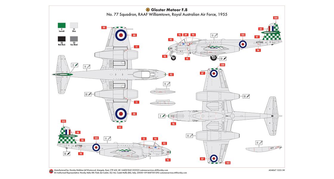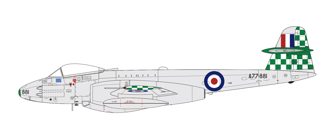 Gloster Meteor F.8 A77-881 was one of the aircraft which returned to Australia in 1954, allocated to No.77 Squadron at Williamtown. With her distinctive green chequered tail and wingtips, she is a fine modelling tribute to the RAAF’s use of the Meteor, so successful in an operational capacity during the Korean War and in more of a commemorative capacity during their short period flying in home skies.