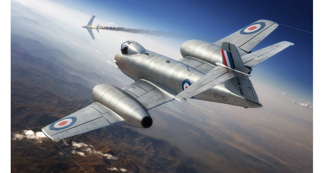 A jet-powered warrior. Beautiful box artwork imagery produced for our 1:48 scale Meteor F.8 tooling, which shows a RAAF Meteor victory over a MiG-15 in 1953 during the Korean War.