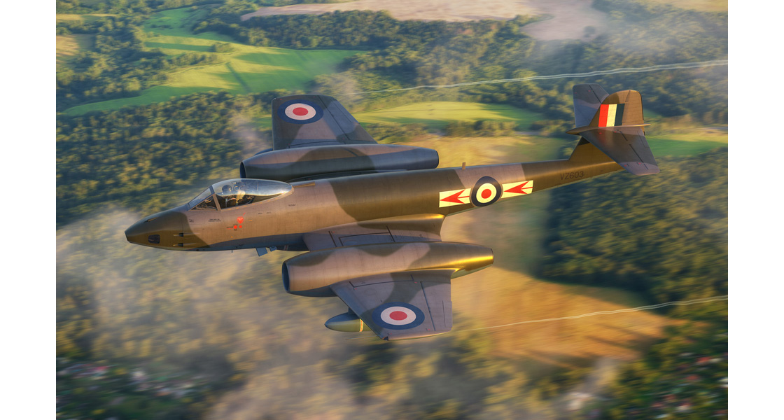 Latest Workbench box artwork exclusive, this time showing an RAF Gloster Meteor FR.9 in the colours of RAF No.79 Squadron flying over an idyllic British countryside scene.